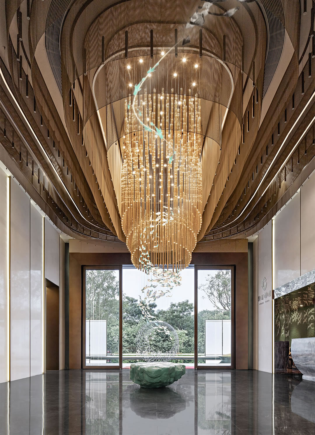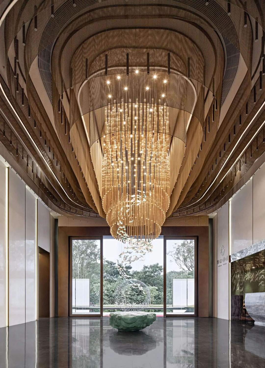 接待大廳丨人與自然的溝通之美,在于形、色、聲的三維一體,聚焦接待前廳,會(huì)發(fā)現(xiàn)"魚爆"景觀從頂部落入視野中央,古銅鎏金的燈光流,如同寬闊鴻大的瀑布,成磅礴之勢,壯麗恢弘,而細(xì)觀其中,則會(huì)被它輕細(xì)優(yōu)美的線條,落入玉盤的朦朧所吸引,最終注目在"船"石之上,讓心靈借著視野的載體,感受一場返璞歸真的游歷。