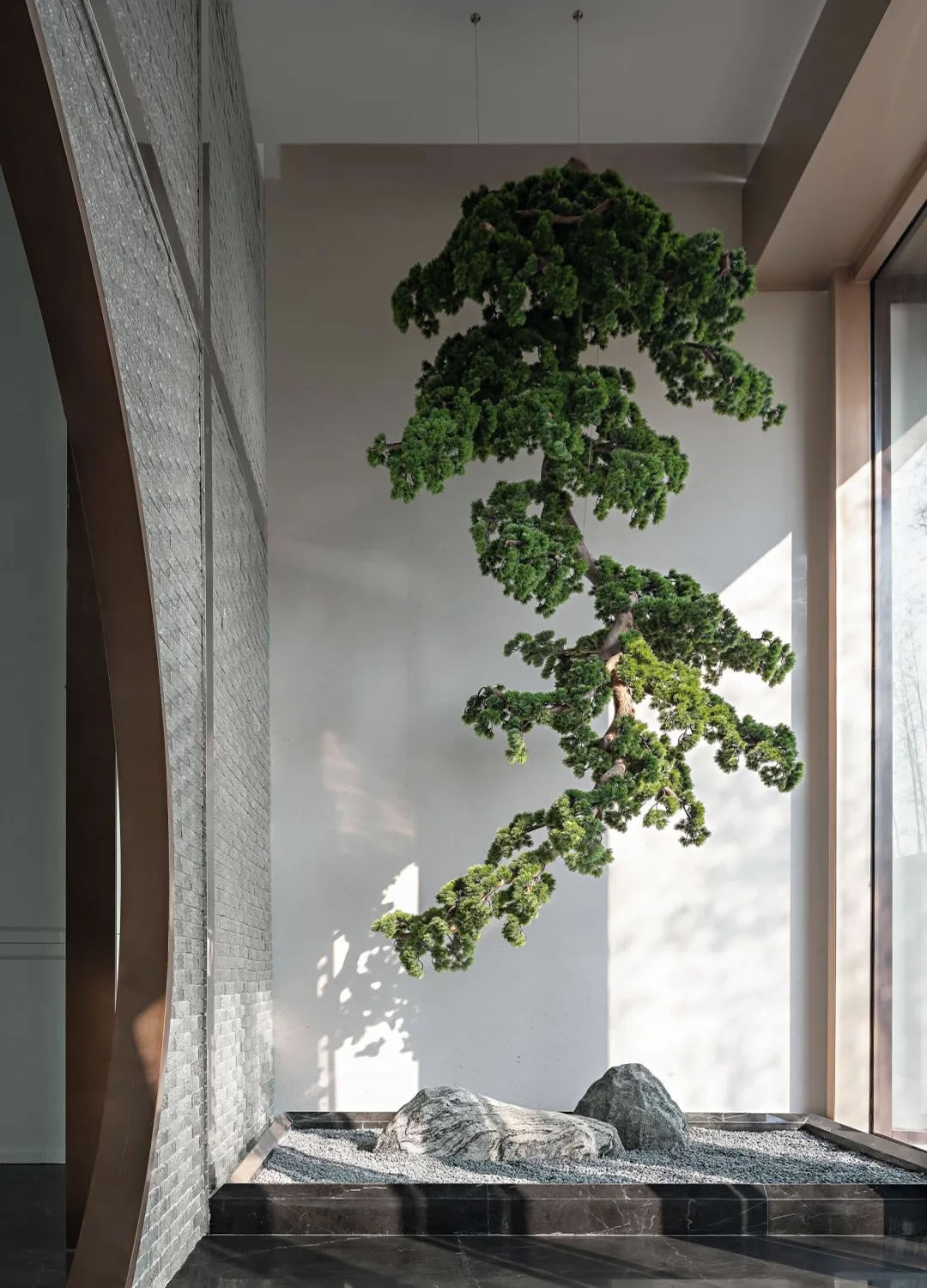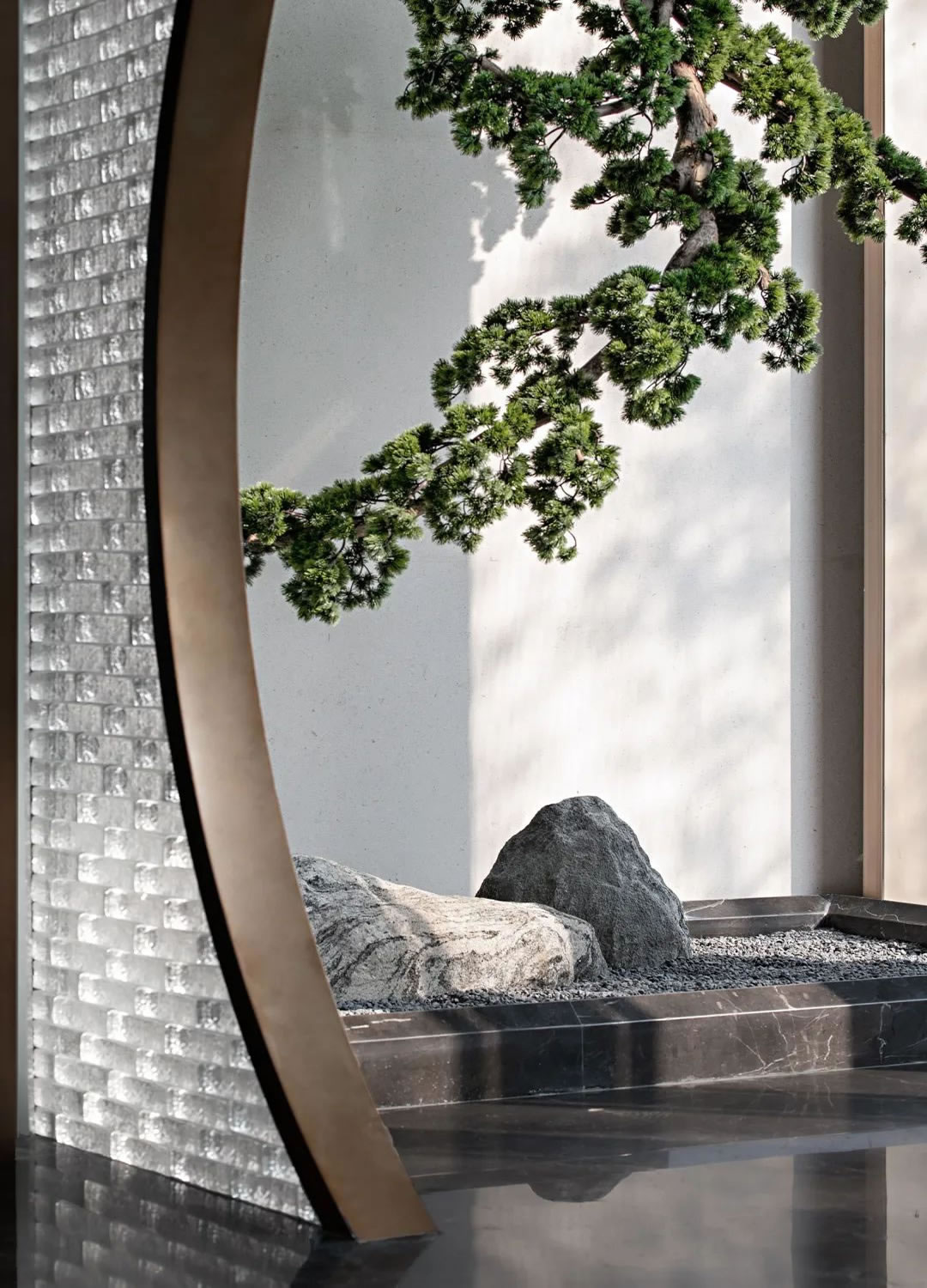 電梯廳·游園丨比起快節(jié)奏里的繁華似錦,方正與圓融塑造的空間意境,更充滿無限的意趣,隨性的倒掛松柏,鋪陳的禪石置景,讓移步的樂趣同樣擁有著靜謐的靈動(dòng),層層遞進(jìn),抵達(dá)至極的從容。