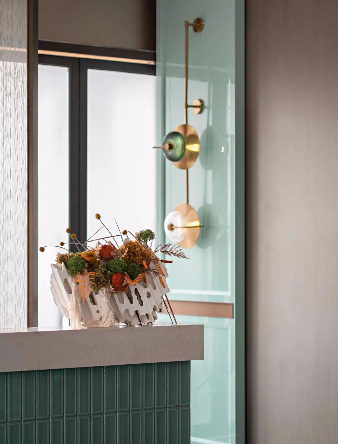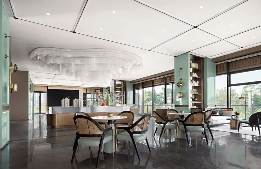 沙盤區(qū)丨石綠的鮮明色彩流變在整個(gè)氛圍之中,將色彩的風(fēng)骨韻味與美學(xué)的極簡形態(tài)融為一體,在整體的明朗開闊布局之下,通過鎏金與浮白的挑染,讓這個(gè)區(qū)域里人與人的溝通擁有著"和"的氣息。