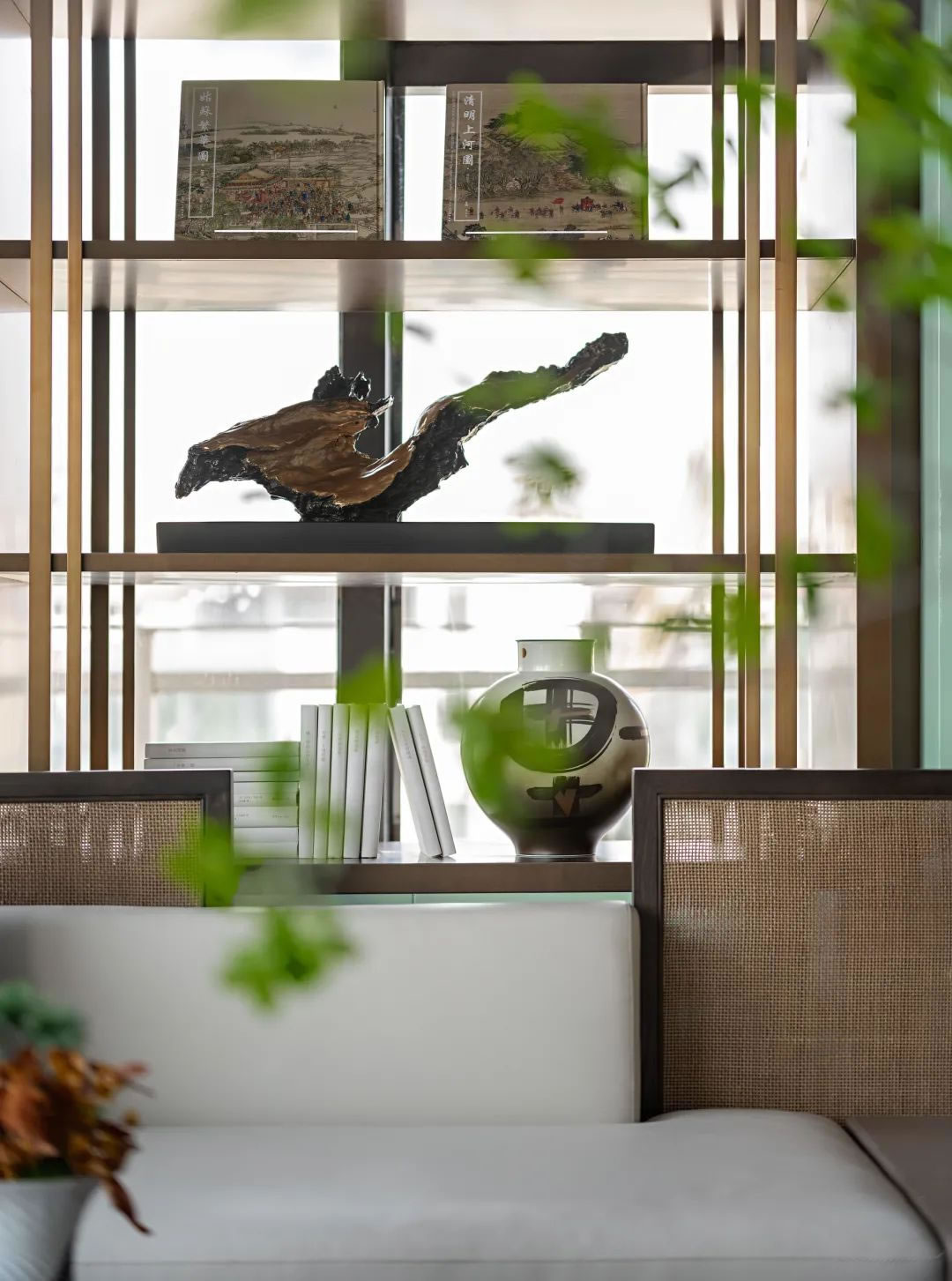 洽談區(qū)丨形與意的平衡,在于"去符號(hào)化",無需傳統(tǒng)的繁復(fù)細(xì)節(jié),只要落座其中,就能將東方美學(xué)的輪廓和意境逐一闡述,木雕、書柵、蘭草,每一種靜物都像是一種韻,讓溝通在審美的蔓延下更加暢通無阻。