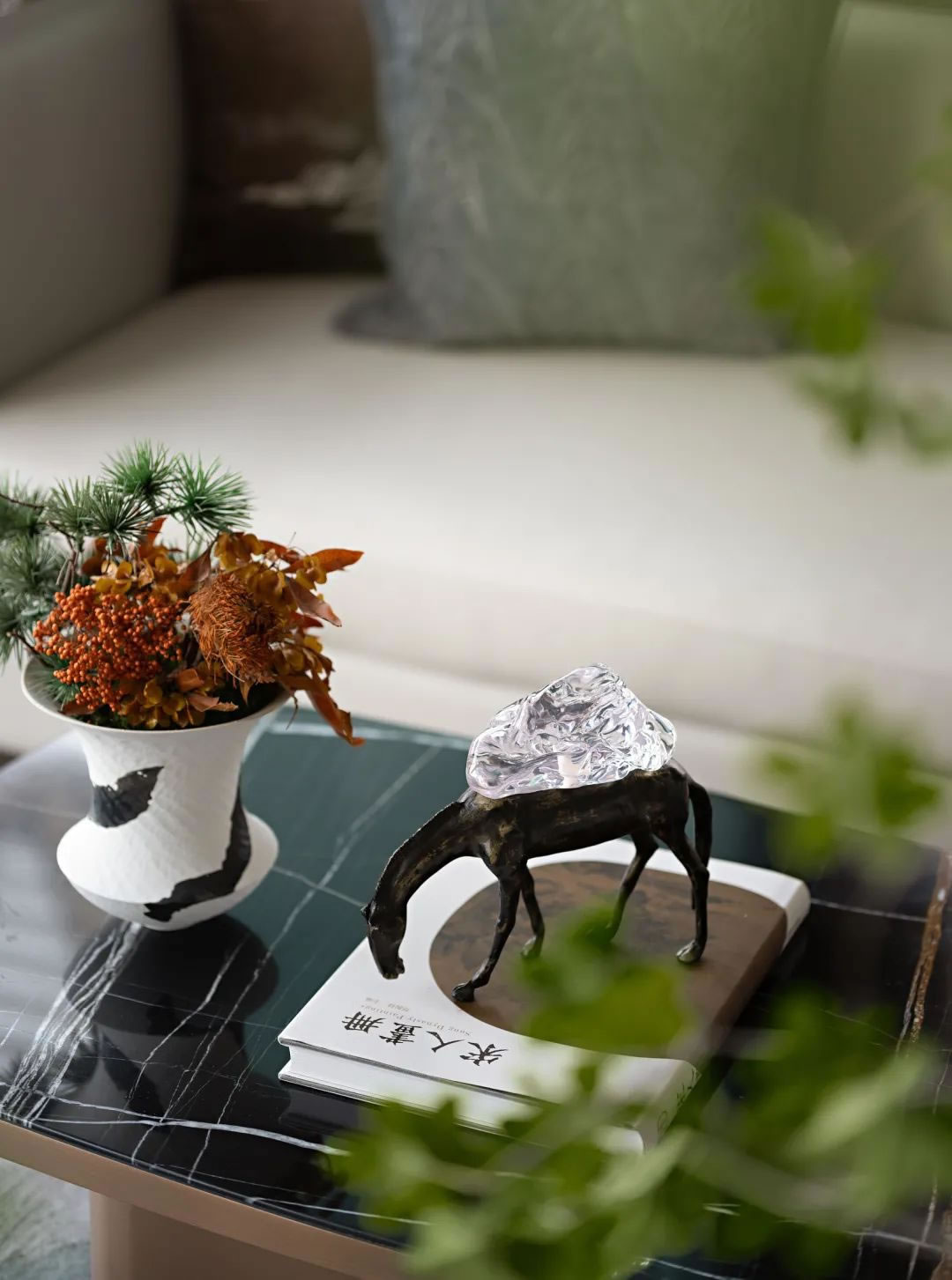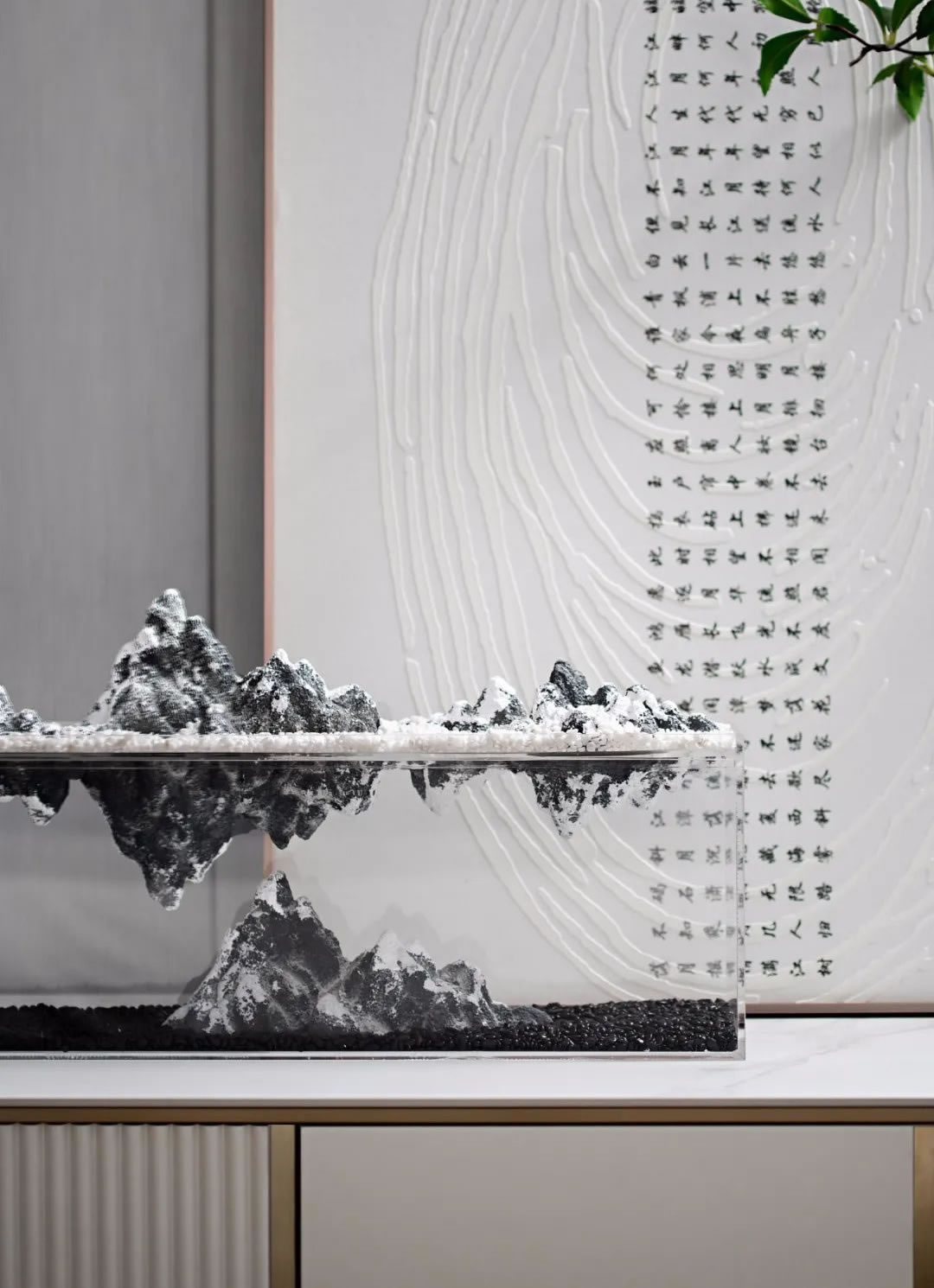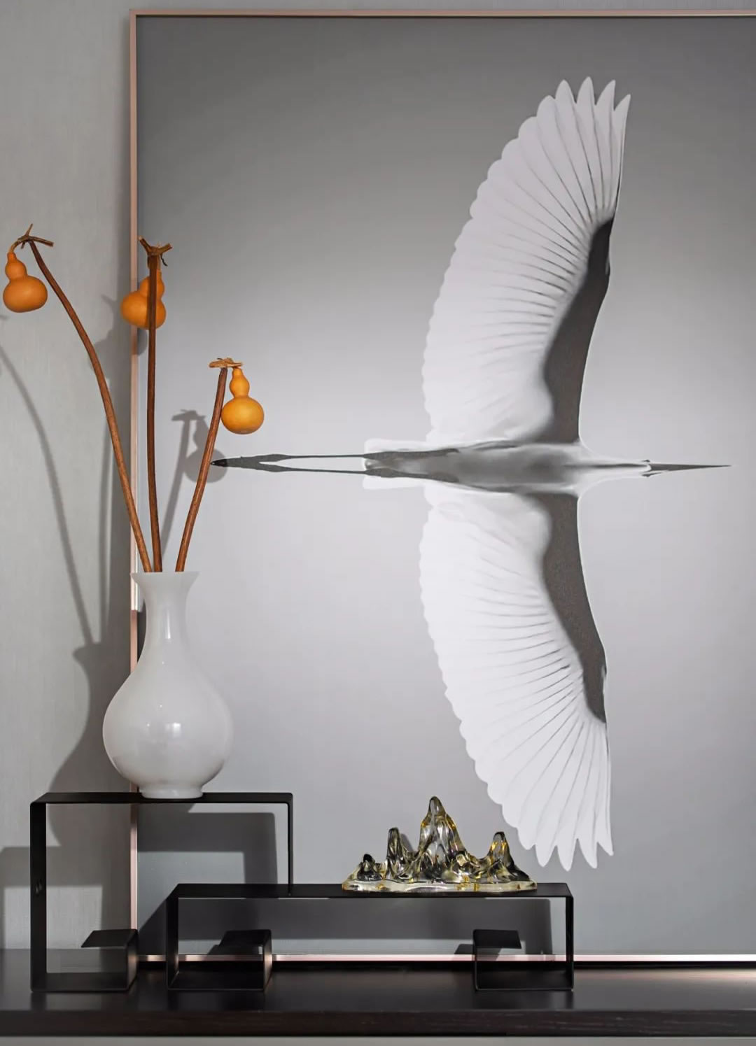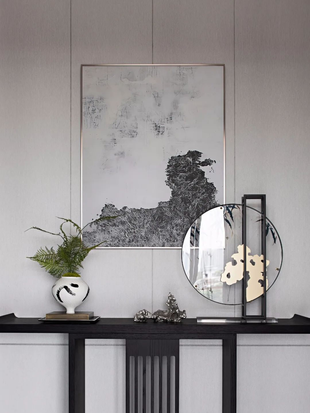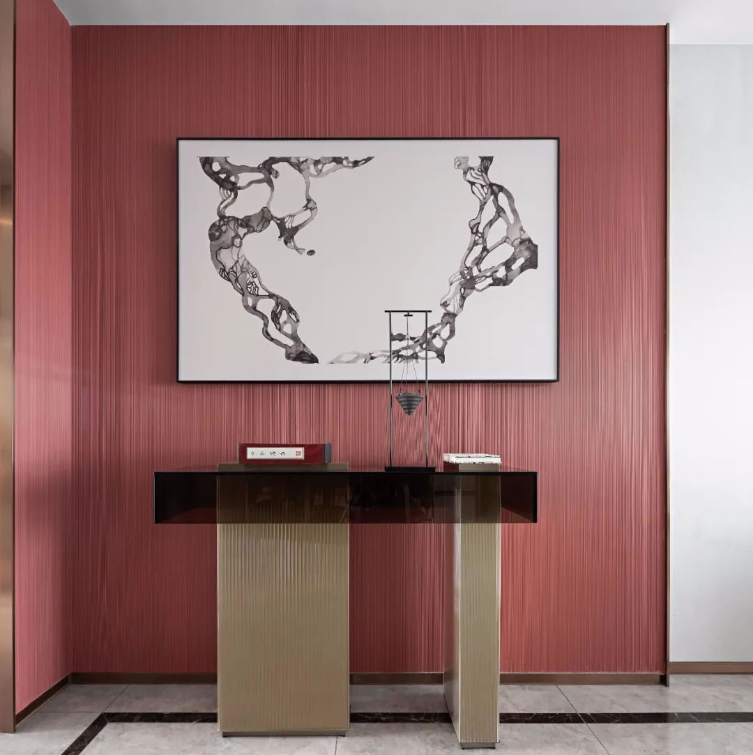 入戶前廳丨東方的極簡崇尚著"少即是多"的樸素理念,推門而入的留白為東方的氣韻增添了更多的藝術(shù)氣息,不受色彩的局限,克制彰顯肌理,浮石的陳設(shè)意境足以讓人定睛,足以彰顯大音希聲,大象無形的人文氣韻。