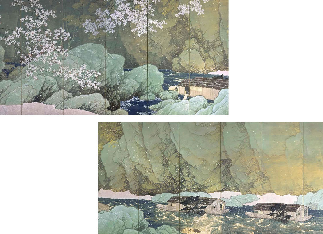 《分卡的春天》河合G子丨峽谷中的河流被花瓣包圍,幾葉扁舟順流而下,藝術(shù)家特別注意水的運(yùn)動(dòng)與環(huán)境的氛圍。