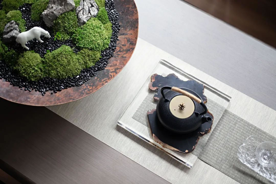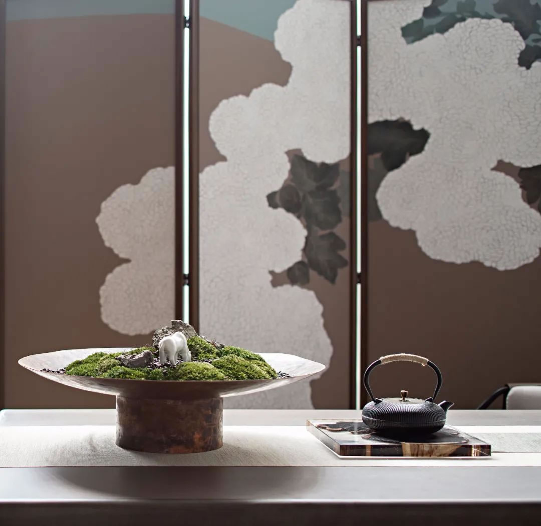 茶室丨茶是人與自然溝通的媒介之一,在空間的木質(zhì)肌理和愜意的案幾置景之上,紙與墨的暢意揮灑,盆與植的合二為一,更有雅致的茶器,醇和的茶香,給午后閑暇的小憩一隅輕松的舒暢,在推杯換盞中品味生活,回味時(shí)光。