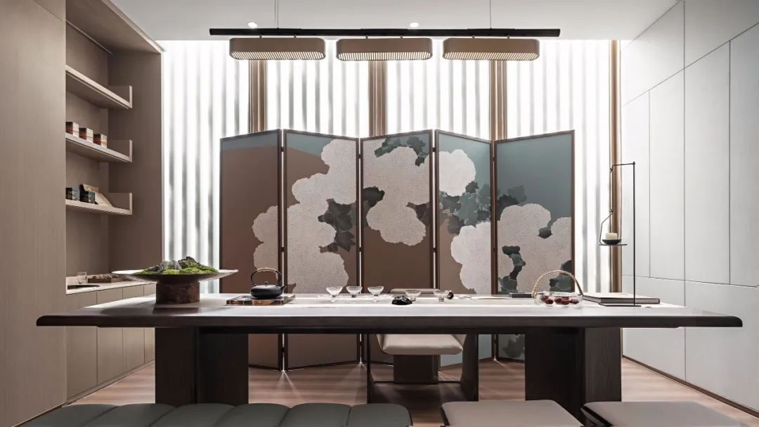 用充滿古風(fēng)意蘊(yùn)的屏風(fēng)作為載體,讓茶室的小酌多了些許怡然情趣,方正的格局搭配著古雅的色調(diào),有著未經(jīng)雕琢的簡約之美,靜心、靜神、靜己。