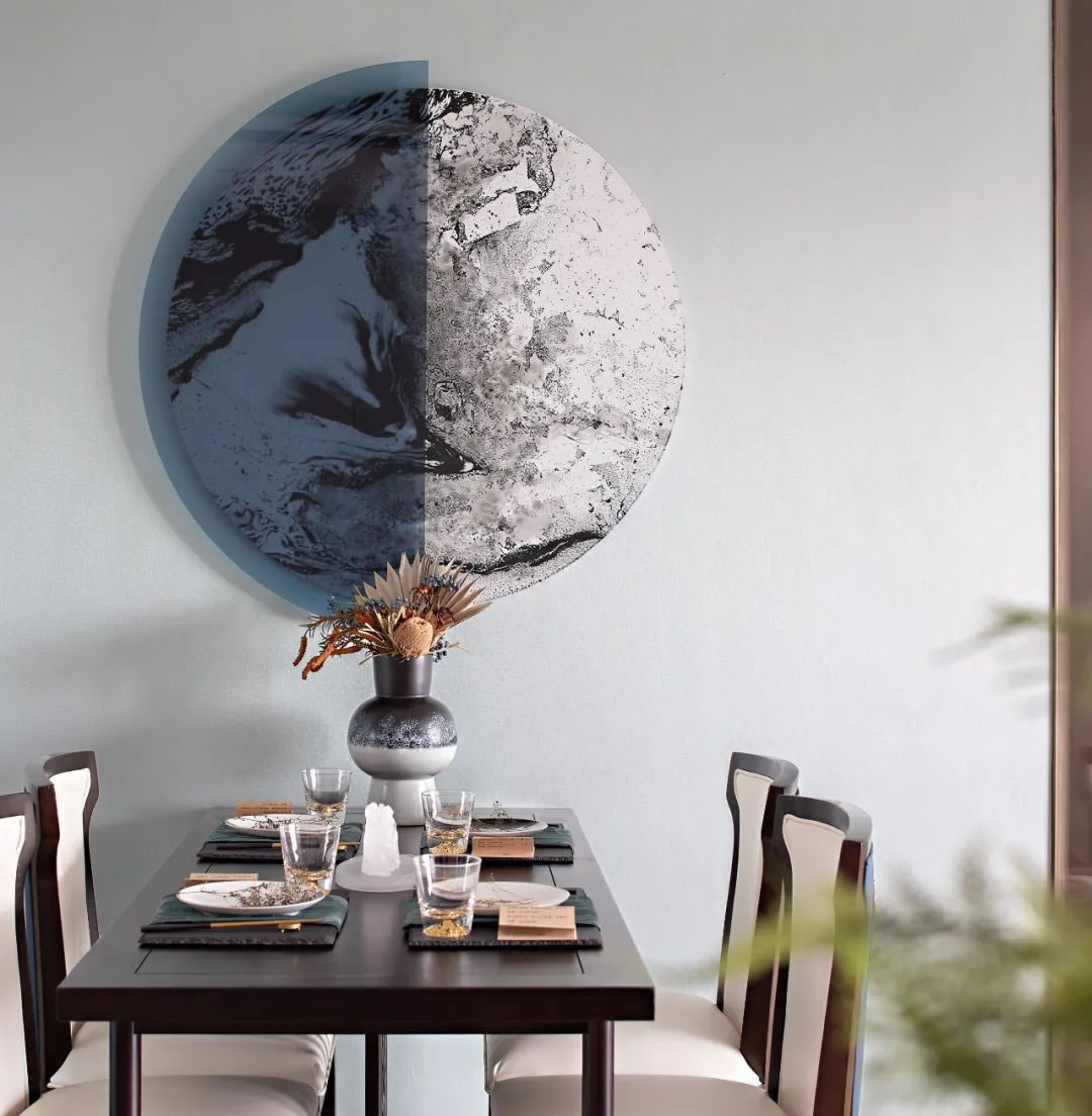 餐廳丨簡約到極致的東方美,往往是不急不躁而又款步有形的,移步至餐廳,圓融的水墨線條畫作讓美的形態(tài)更加具象,與一杯一盞一盤一器映射開來,給美食的記憶增添了更多情感的鏈接。