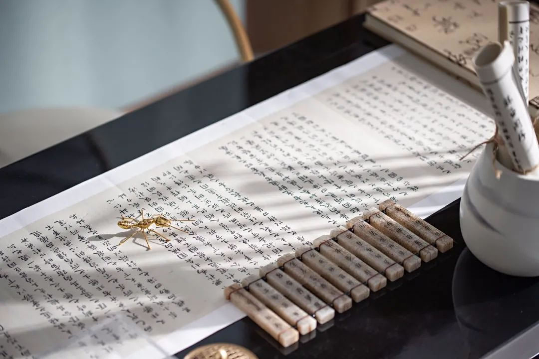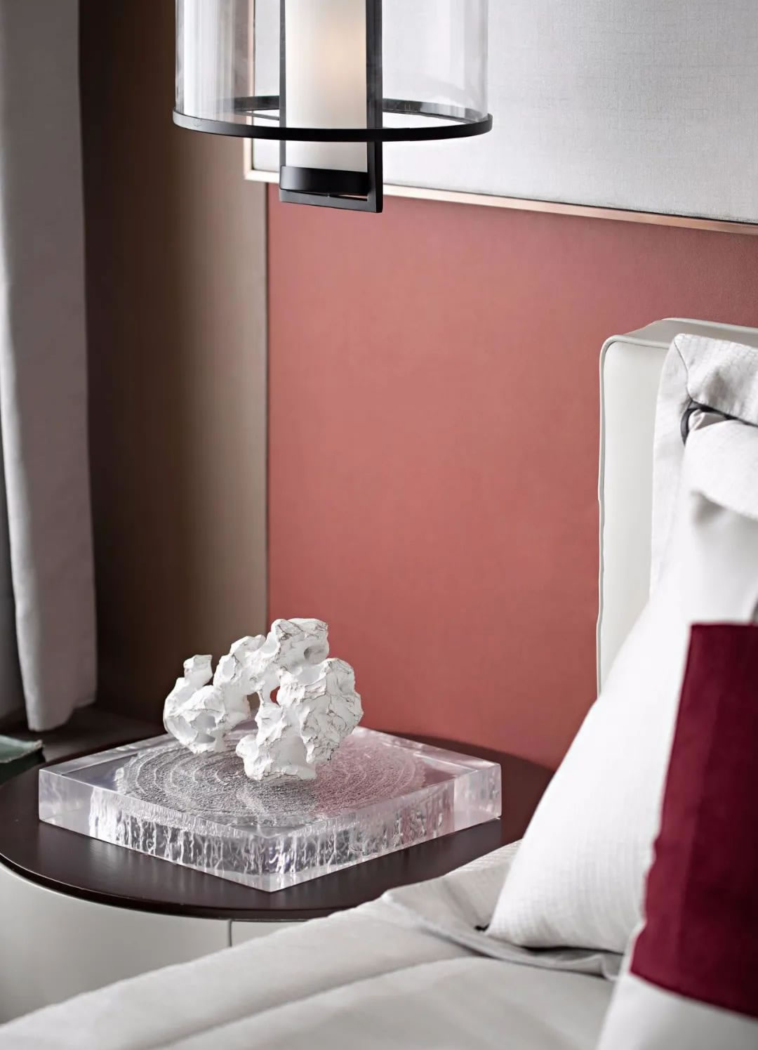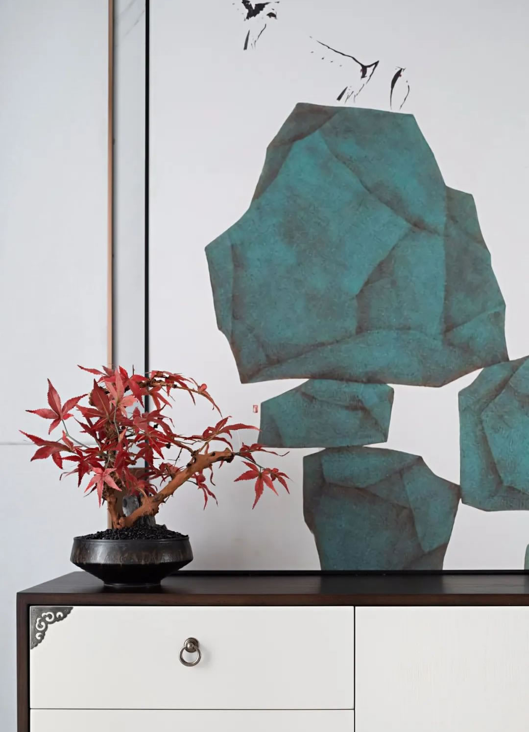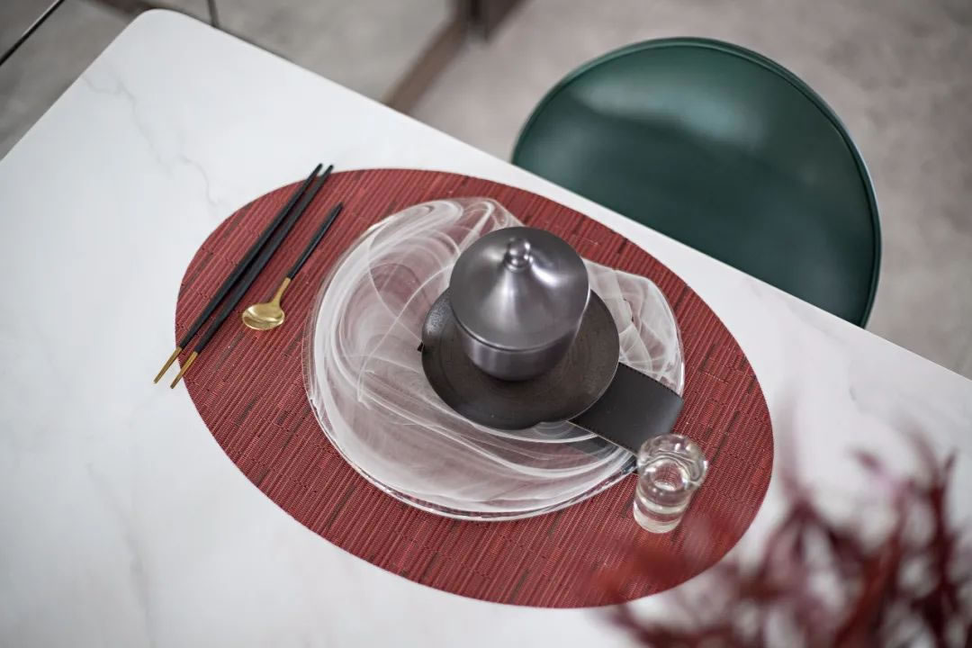 臥室丨朱砂紅的色彩格局在主臥的視野中蔓延開來,而松石綠如同點(diǎn)睛之筆,將場景暈染出情緒色彩,床頭那一尾禪靜的壘石,柜面那一抹楓葉的彩染,窗欞那一場愜意的品茗,或靜或動(dòng),或定或閑,讓生活既是景中畫,也是畫中景。