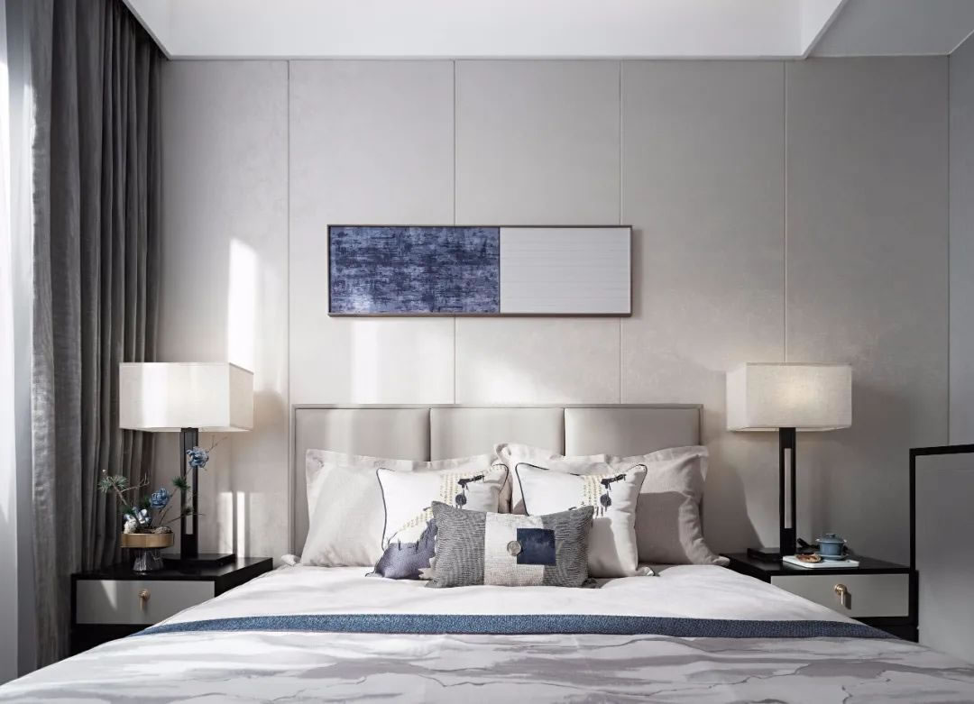 主臥丨浮白在空間的氣場流動(dòng)中貫穿始終,是布景的竹韻水墨,是壁畫的儀式色彩,是靜物的多維神韻,在東方韻律的表達(dá)和秩序的營造中既柔和又秀美,帶著傳統(tǒng)形態(tài)的載