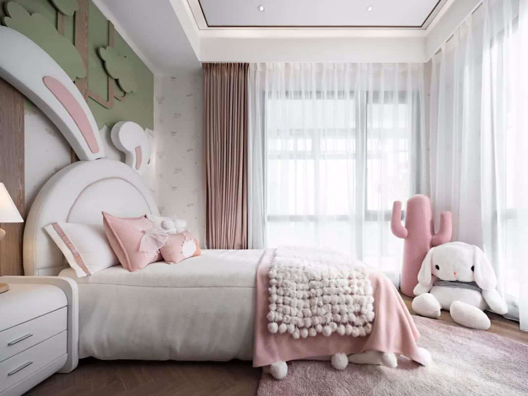 兒童房丨寄趣于童真的比得兔,在這個(gè)空間的原野上奔跑著,粉的色彩傳遞著活力,光的通透陪伴著成長,自由的動(dòng)線塑造,玩偶的生動(dòng)精巧,讓陪伴不止是一個(gè)空間的塑造。