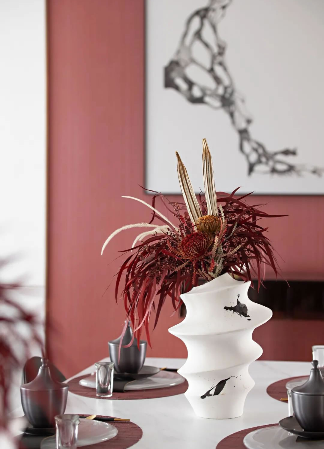 餐廳丨朱砂紅的色彩過渡讓餐廳的空間如同一場沉浸式的靈感釋放,一副寫意的畫作,解構(gòu)了傳統(tǒng)用餐場景的通俗關(guān)系,一隅陳設(shè)的案幾,賦予了空間儀式的意境,一杯一盞都是極具張力的文化渲染。