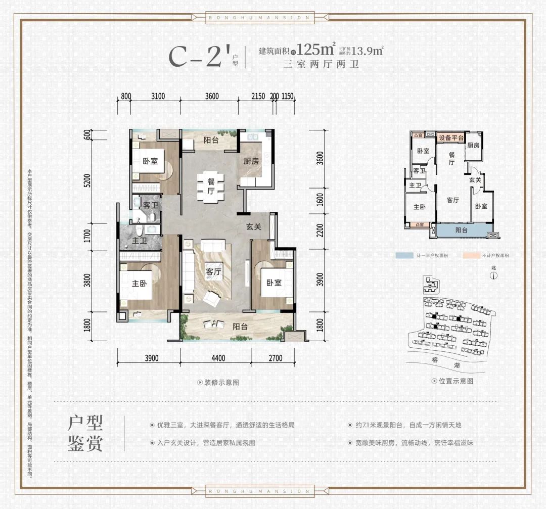 約5.5-9米闊景陽臺,大戶型三陽臺設計,南北通透,讓榕湖美景與美學園林盡收眼底